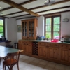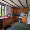 Kitchen/Dining Room - 5.1 x 4m with tiled floor, exposed beams, fitted wood kitchen units to 2 walls, 2 double windows looking over the gardens and door to small room housing the washing machine and water heater.