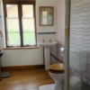 Bathroom - 3 x 1.7m with double window to side gardens, shower cubicle, hand basin, towel rail and WC