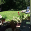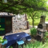 Gite Terrace with eating area leading to hot tub, well and again private gardens with mature trees and shrubs.