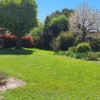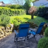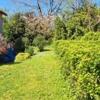 The garden is spacious and has old fruit trees and various seating areas. It is partially walled and there are entrance gates.